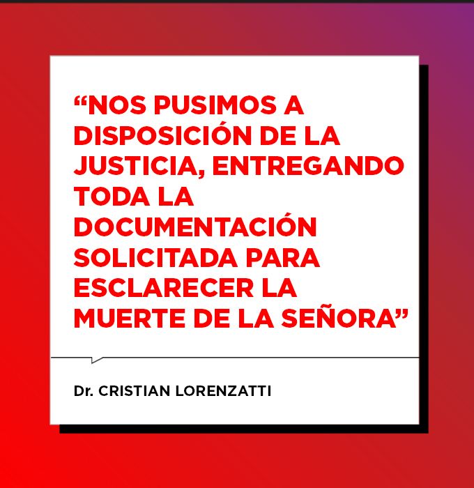 Lorenzatti explicó que Zulma, la mujer fallecida, estaba internada hacía 12 días “con un cuadro grave, que se trató de estabilizar en varias ocasiones y finalmente le causó la muerte. La pérdida de la mamá de Juan, de nuestra paciente, es algo que lamentamos muchísimo y es un dolor profundo para todos los médicos”, afirmó, y aclaró la intención de colaborar para el esclarecimiento de lo sucedido: “Nos pusimos a disposición de la justicia entregando toda la documentación solicitada para esclarecer la muerte de la señora”.