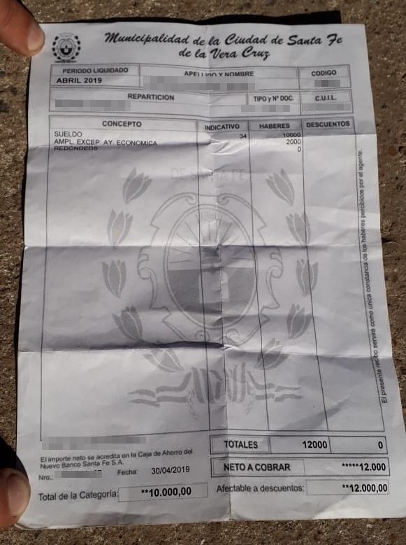 A su lado, otro de los empleados despedidos mostró un “recibo” de sueldo bien “fresquito” (tiene fecha del 30 de abril) pero muy extraño: no aclara su categoría, su antigüedad, ni sus aportes. Si tiene la marca de agua del municipio y la palabra sueldo. El trabajador tiene más de 60 años, también lo despidieron y no sabe qué va a hacer de su vida porque llevan años de trabajo sin aportes.