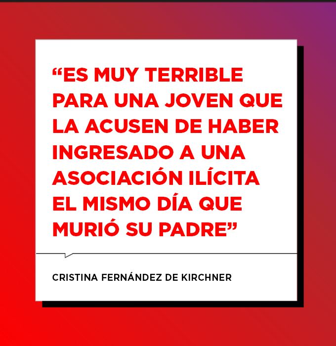 Y continuó: “Es muy terrible para una joven, que la acusen de haber ingresado a una asociación ilícita el mismo día que murió su padre, sí, el 27 de octubre de 2010”.