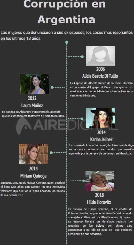 A partir de la denuncia de Hilda Horovitz se destapó una de las causas por corrupción más escandalosas de Argentina pero los antecedentes de mujeres que denunciaron a sus ex maridos por corrupción se remonta a 13 años atrás.