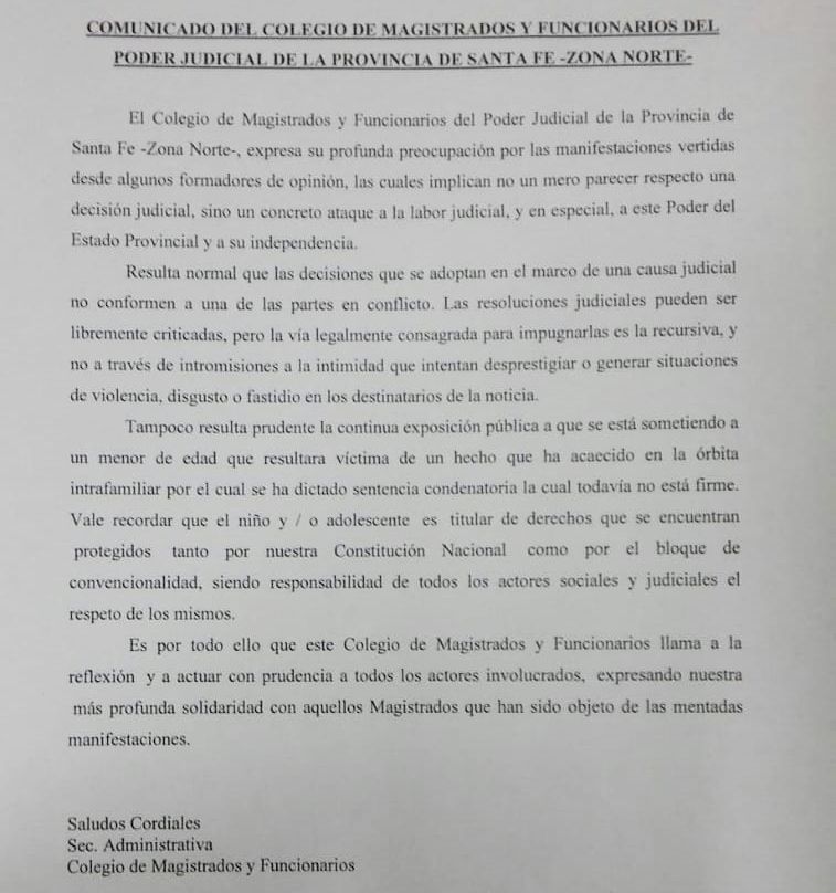 Puntualmente, el comunicado del Colegio de Magistrados apuntaba contra los cuestionamientos surgidos desde el periodismo por la decisión de los jueces Jorge Andrés y Sebastián Creus de dejar en libertad a los condenados por el abuso sexual intrafamiliar de un niño de la ciudad de Esperanza, conocido popularmente como “Caso Baraldo”.