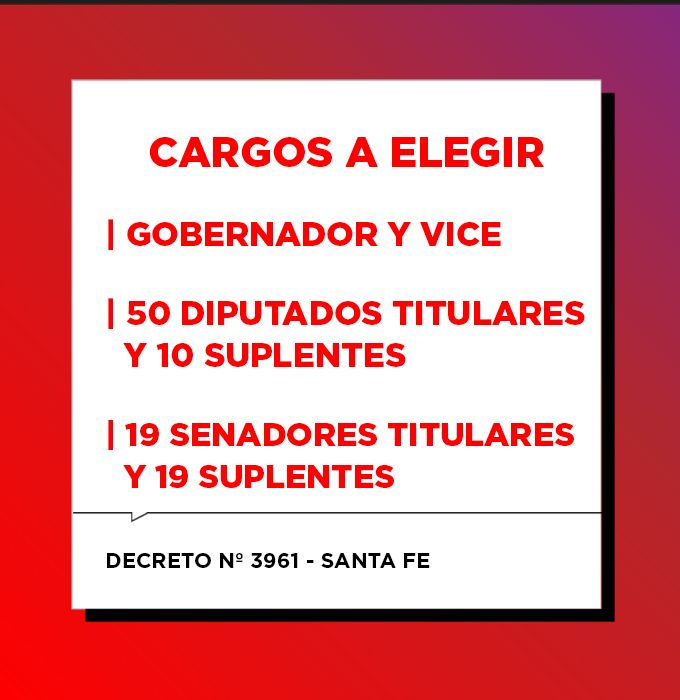 Los cargos a elegir son gobernador, vicegobernador, 50 diputados titulares y 10 suplentes, 19 senadores titulares (uno por departamento) y 19 suplentes.