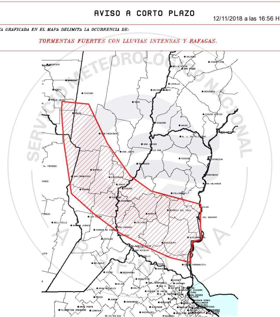 También está vigente un aviso meteorológico a corto plazo, emitido por el SMN, por altas probabilidades de tormentas fuertes con lluvias intensas para nuestra región.