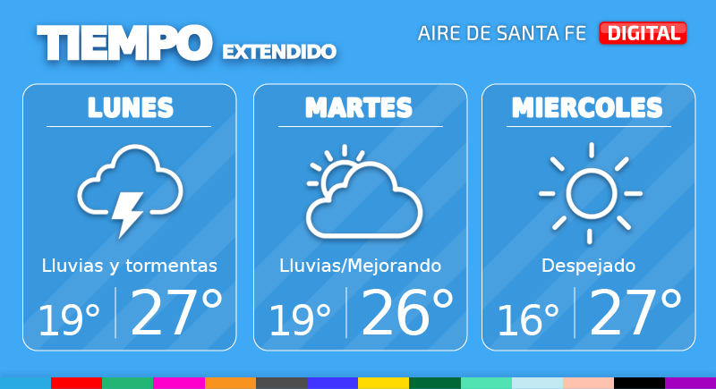 Mañana martes cielo cubierto con 70% de probabilidades de lluvias y tormentas durante la madrugada, pero luego mejorando paulatinamente en el transcurso del día. Descenso de las temperaturas con mínima de 17° hacia finales de la jornada, 19° por la mañana y una máxima de 26° y vientos leves a moderados del sudoeste con ráfagas de mayor intensidad. El miércoles cielo despejado. Temperatura mínima de 16°, máxima de 27° y vientos leves a moderados del sudoeste.