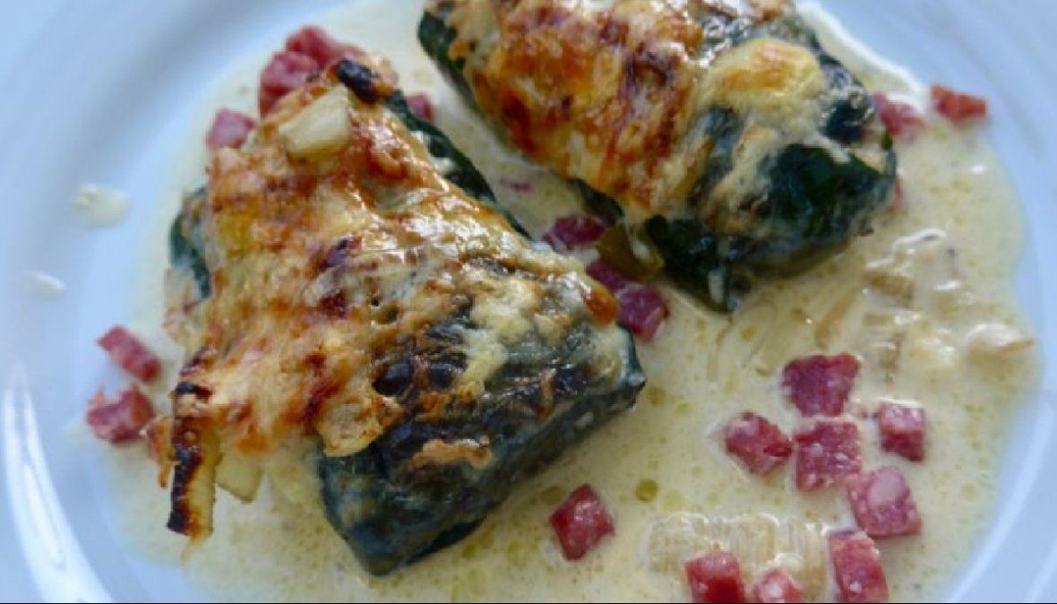 Para eso necesitas: 14 hojas de acelga, 50 gramos de salame, cantimpalo o longaniza o 6 fetas de jamón crudo, 1 huevo, 40 g de queso rallado, 300 ml leche, 160 g harina, 300 ml de caldo, pimienta negra, nuez moscada y sal.