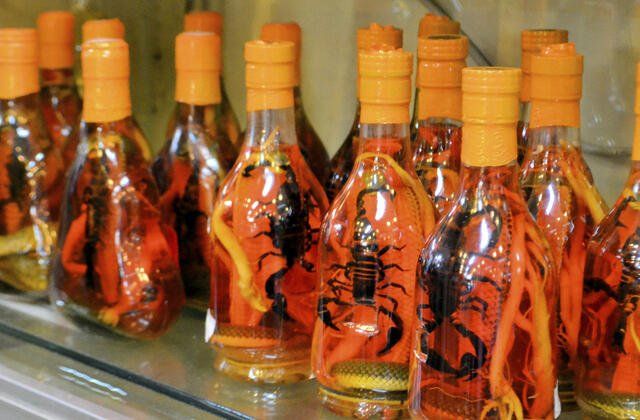 En la región norte de México y en algunas regiones chinas, se acostumbra cristalizar alacranes y/o escorpiones para adornar mezcal mexicano o maotai, según la ubicación. En algunas regiones asiáticas aún se cree que beber licor de alacrán otorga vitalidad y buena suerte para los estudios. Su graduación varía entre los 30° y 55°.