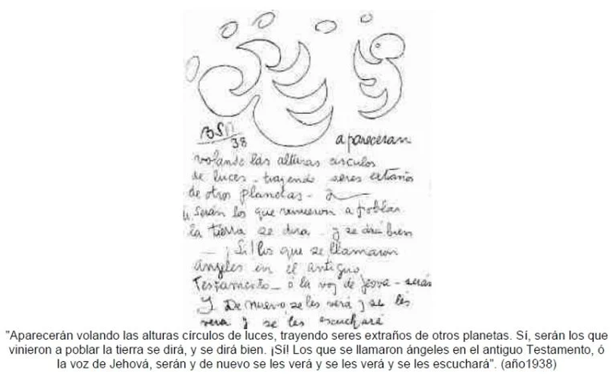 Pocos días después, adelantó: "Aparecerán volando las alturas círculos de luces, trayendo seres extraños de otros planetas. Si, serán los que vinieron a poblar la tierra se dirá y se dirá bien. Si. Los que se llamaron ángeles en el antiguo testamento, o la voz de jehová".