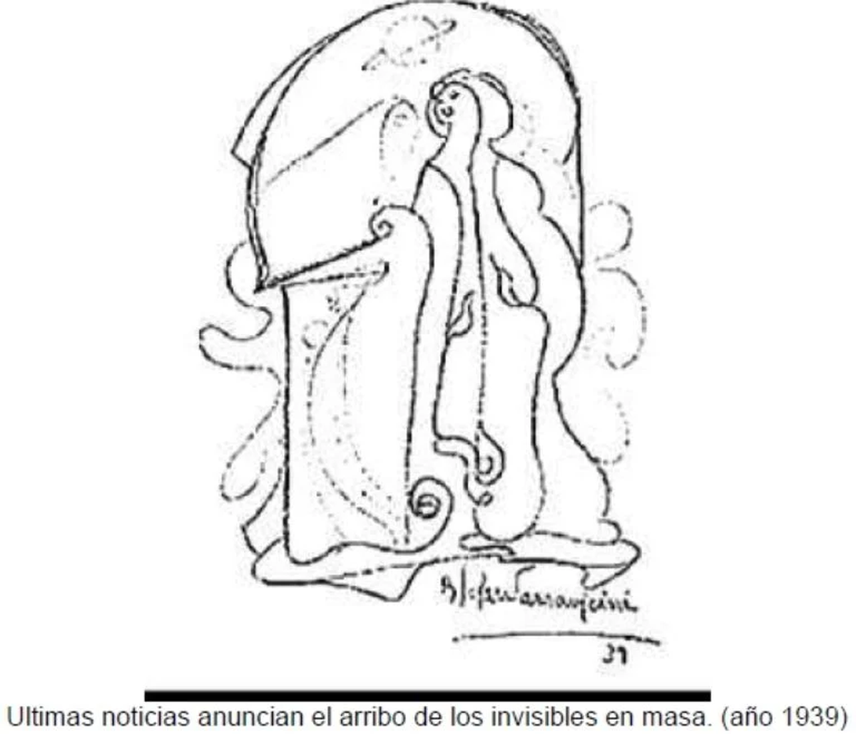 En 1938, Parravicini publicó un dibujo en el que se observa un objeto similar a un plato detrás de líneas que emulan olas de mar y otras formas que simulan nubes.
