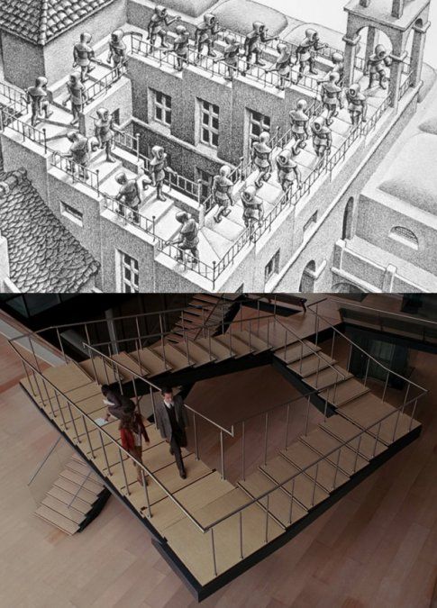 «Inception” (2010), de Christopher Nolan, habla del mundo de los sueños y la irrealidad, así como la obra de Escher «Escaleras arriba, escaleras abajo», que se caracterizó por jugar con la ilusión óptica.