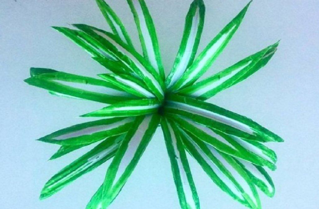 - Con la parte superior que te quedó de la botella, harás las hojas; tomá las tijeras y empieza a cortarla en forma de tiras, de manera que estas sean largas y un poco delgadas.