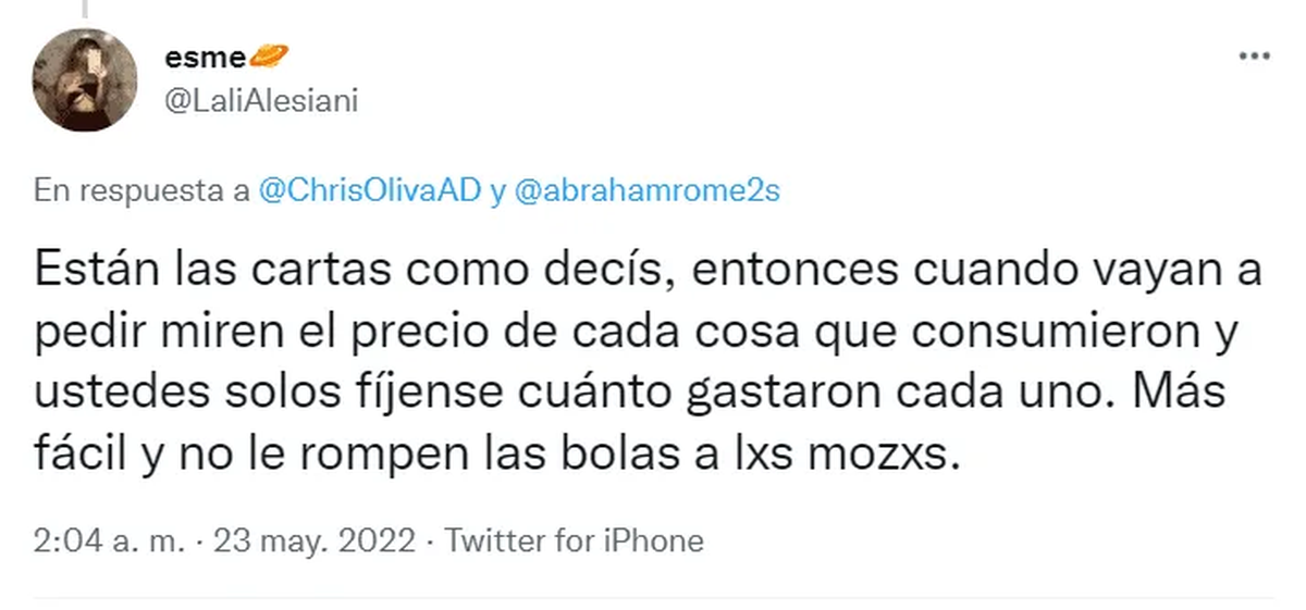 La publicación obtuvo más de 154 mil “me gusta” y casi 2.300 comentarios con las aguas divididas: “Están las cartas como decís, entonces cuando vayan a pedir miren el precio de cada cosa que consumieron y ustedes solos fíjense cuánto gastaron cada uno. Más fácil y no le rompen las bo… a lxs mozxs”, escribió una usuaria, claramente en favor de la medida dispuesta por el restaurante. “Intenta cobrar una mesa de 10 personas y que cada una te diga a mi me cobras un agua y una ración, a mi la mitad de la ración y una Coca-Cola…etc, y tener que hacer mil cálculos diferentes para que luego falte plata y volver a empezar”, sumó otro, en la misma línea.