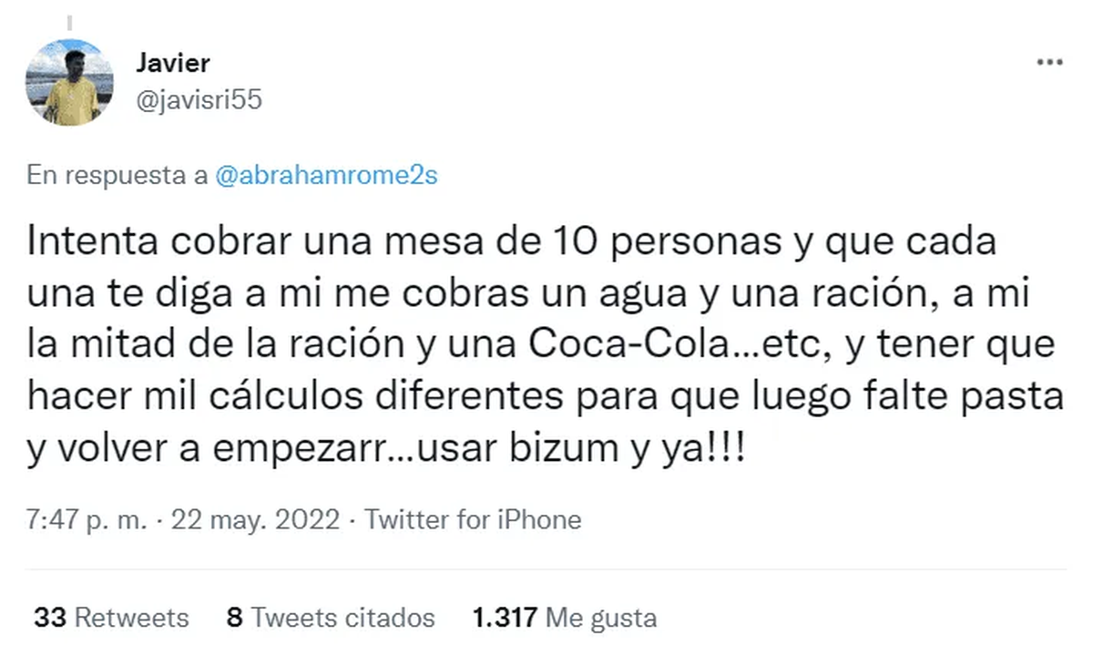 Por otro lado, estuvieron quienes compartieron la moción de dividir todo por igual: “Nosotros dividimos la cuenta entre 10 y ya está, da igual que uno se toma cinco cañas y otro tres”, y otro que fue en contra de que uno pague todo y después “le devuelvan”: “Como joder al único que tiene mucho dinero o al que tiene targeta de debito JAJAJJA porque luego "se lo dan a él" y algún que otro billete no llega”.