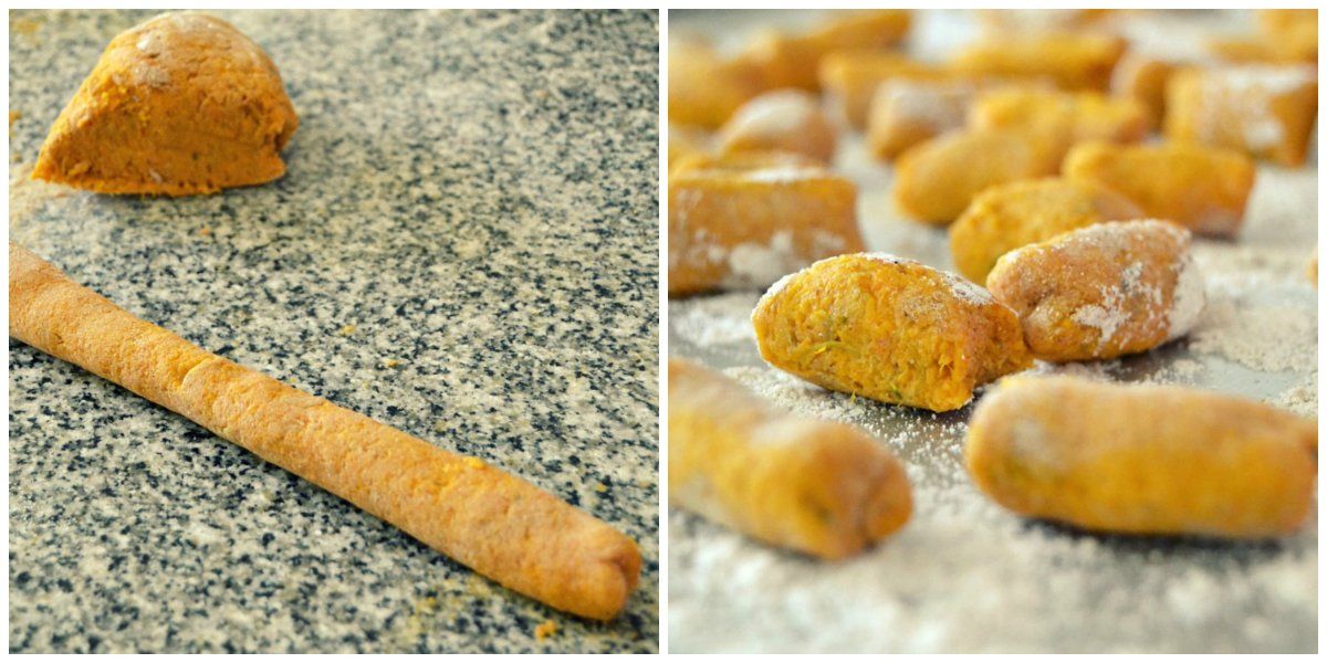 Retirar la calabaza del agua, quitarle la cáscara y hacer un puré suave. Armar una corona de harina y en el centro colocar el puré de calabaza y los huevos. Añadir una pizca de pimienta y sal. Mezclar todos los ingredientes formando una pasta. A medida que se amasa añadir harina para elaborar una masa lisa, poco pegajosa y liviana.