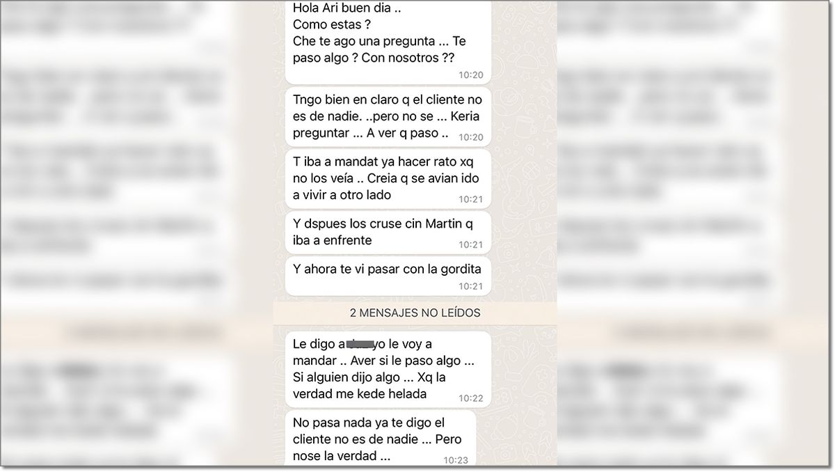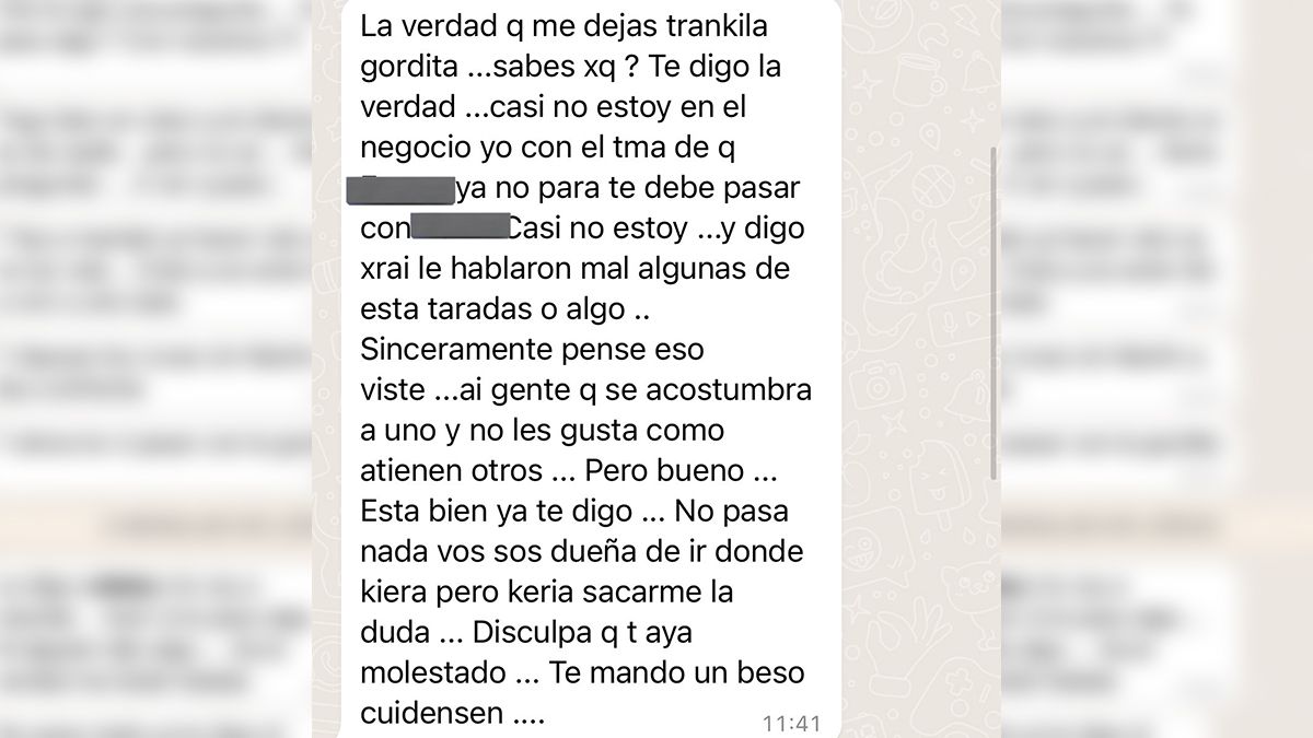 Ante la respuesta enviada, la almacenera contestó en buenos términos. "Me dejás tranquila, gordita. Pensé que por ahí te habían hablado mal algunas de esas taradas. Disculpá que te haya molestado, te mando un beso", finaliza el intercambio de mensajes entre la dueña del negocio y su clienta "infiel".