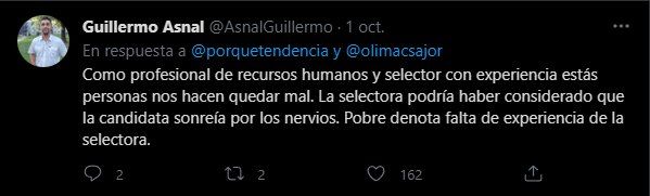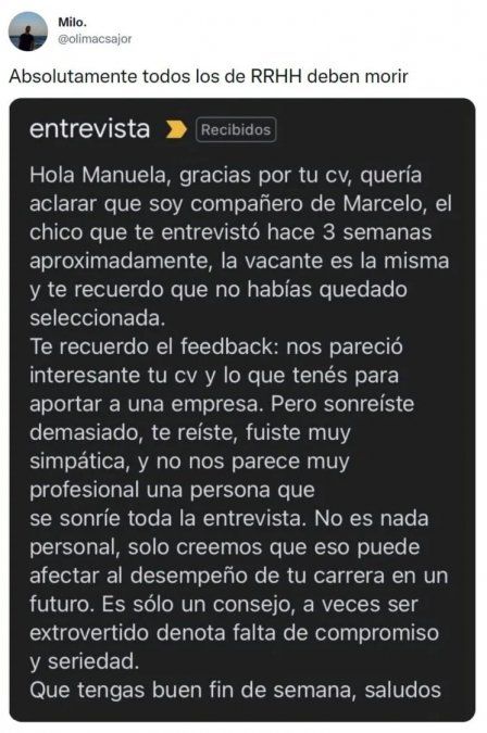 "Absolutamente todos los de RRHH deben morir", expresó el usuario que publicó el tuit, seguido de una captura de pantalla del correo electrónico que el personal de RRHH le envió a una postulante a un trabajo: "Hola Manuela, gracias por tu cv, quería aclarar que soy compañero de Marcelo, el chico que te entrevistó hace tres semanas aproximadamente, la vacante es la misma y te recuerdo que no habías quedado seleccionada. Te recuerdo el feedback: nos pareció interesante tu cv y lo que tenés para aportar a una empresa. Pero sonreíste demasiado, te reíste, fuiste muy simpática y no nos parece muy profesional que una persona que sonríe toda la entrevista. No es nada personal, solo creemos que eso puede afectar al desempeño de tu carrera en un futuro. Es sólo un consejo, a veces ser extrovertido denota falta de compromiso y seriedad. Que tengas buen fin de semana, saludos".