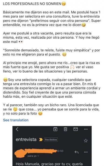 Al parecer la protagonista de esta historia se llama Manuela Fernández (@neeela95), quien contó que envió su CV dos veces a la misma empresa y que, en la primera, le habían contestado de una manera más aceptable. Sin embargo, en el segundo email le dijeron que la habían rechazado por "sonreír demasiado y ser muy simpática".