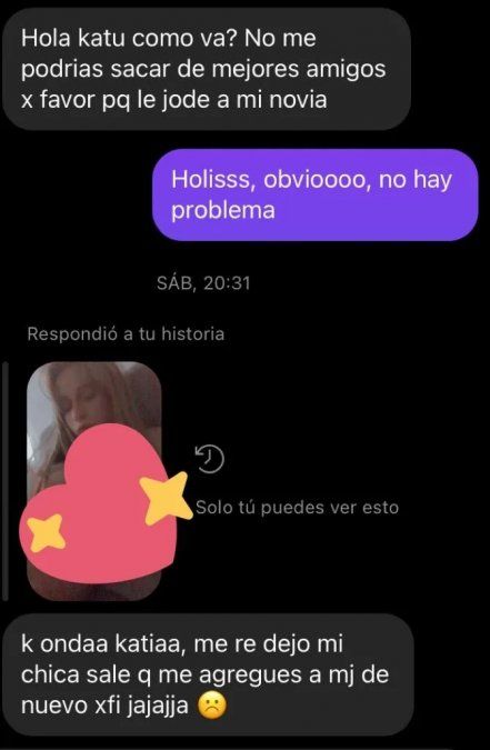 "Holisss, obvio, no hay problema", le respondió ella. Pero tal cual lo dice el refrán, el que se va sin que lo echen vuelve sin que lo llamen. Días después, el chico volvió a aparecer y le escribió en el chat: "K onda katiaa, me re dejo mi chica, q me agregues a mj de nuevo porfi jajaja". La captura de pantalla se viralizó en segundos y las humoradas, memes y Gifs no tardaron en llegar. Todos los usuarios saben que el aparecer en los "Mejores amigos" de alguien (la historia de Instagram marcada en verde) es sinónimo de problemas con tu pareja.