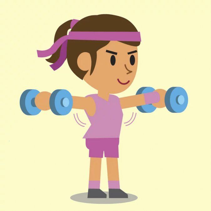 - Levanta los brazos hacia afuera y hacia el costado del cuerpo. La idea es que la mancuerna quede en línea recta con los hombros.