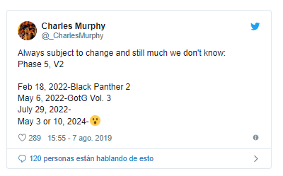 Según Murphy, podríamos esperar Black Panther 2 para el 18 de febrero de 2022, Guardianes de la Galaxia Vol.3 para el 6 de mayo de ese mismo año, y también una tercera película para el 29 de julio. Esta, lo más probable es que se trate de Blade, que ya está anunciada para 2022, o incluso la secuela de Capitana Marvel. Respecto a su tweet, lo que más ha llamado la atención es la fecha para 2024, acompañada de un emoticono de sorpresa.