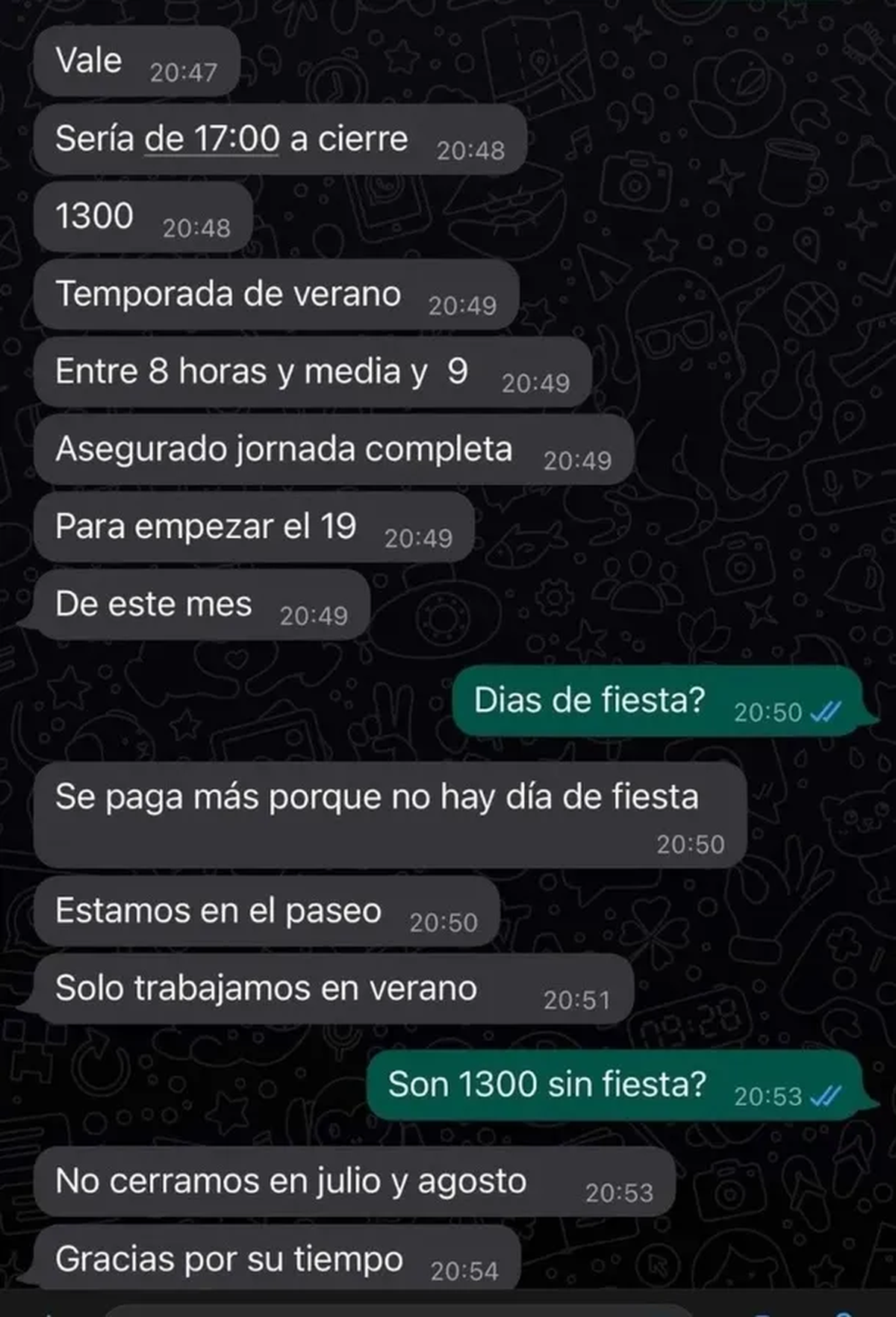 “Se paga más porque no hay días de fiesta”, le responde sin vuelta el propietario del local, que justifica su postura aludiendo que el negocio solamente abre los meses de verano. “¿Son 1.300 euros sin fiesta?”, replicó incrédulo el mozo.