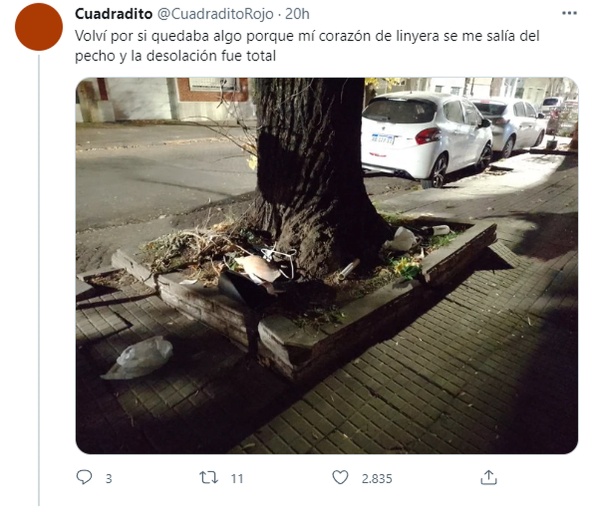 Finalmente, el usuario que publicó el tuit que se viralizó comentó que más tarde pasó a ver si quedaba algo, pero ya no había nada. “Volví por si quedaba algo porque mí corazón de linyera se me salía del pecho y la desolación fue total”, cerró.
