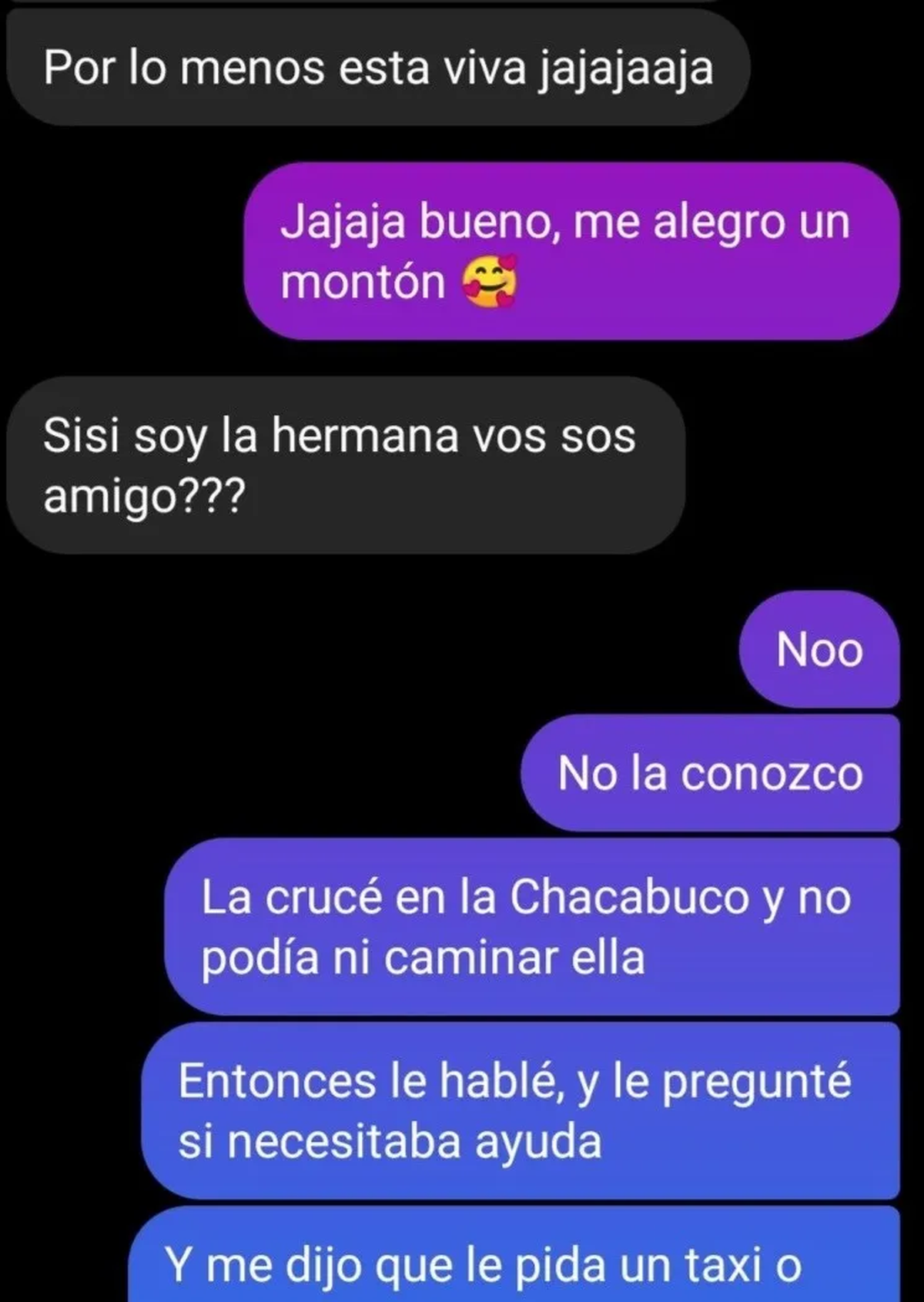 Sin embargo, la historia no terminó ahí. Tomi encontró a la hermana de la chica que ayudó en Instagram, esta le contó que la joven llegó al departamento y le agradeció por haberla acompañado hasta la casa, incluso hubo un ofrecimiento de dinero.