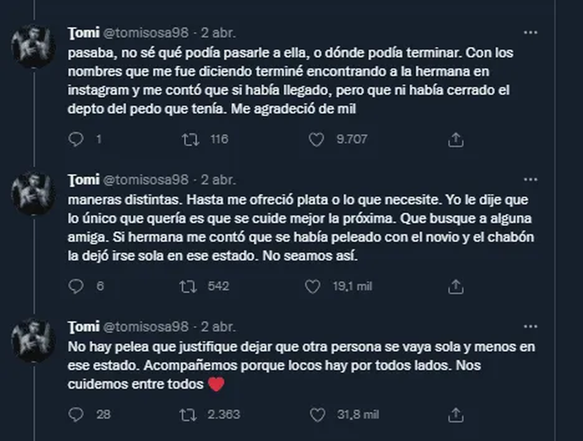 El autor del tuit dio más detalles de lo que había pasado esa madrugada antes de encontrarse con la joven: "La hermana me contó que (la chica) se había peleado con el novio y el chabón la dejó irse sola en ese estado".