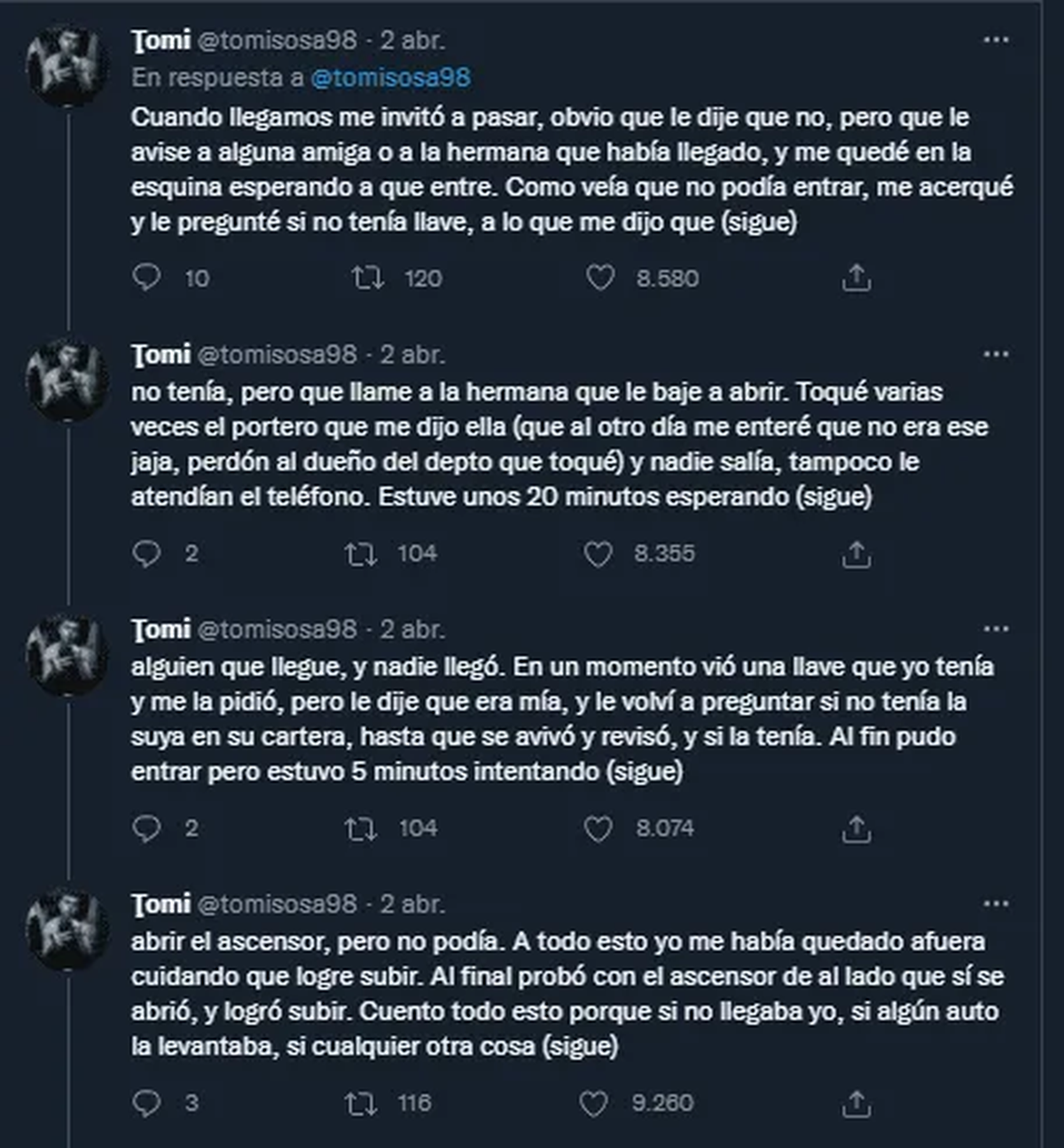 En medio de la espera, la chica vio que él tenía una llave y se la pidió, pero Tomi le dijo que era de él y le volvió a consultar a ella si tenía con qué abrir la puerta. "Se avivó y revisó, y sí la tenía. Al fin pudo entrar, pero estuvo 5 minutos intentando abrir el ascensor, pero no podía. A todo esto yo me había quedado afuera cuidando que logre subir", detalló el autor del tuit viral.