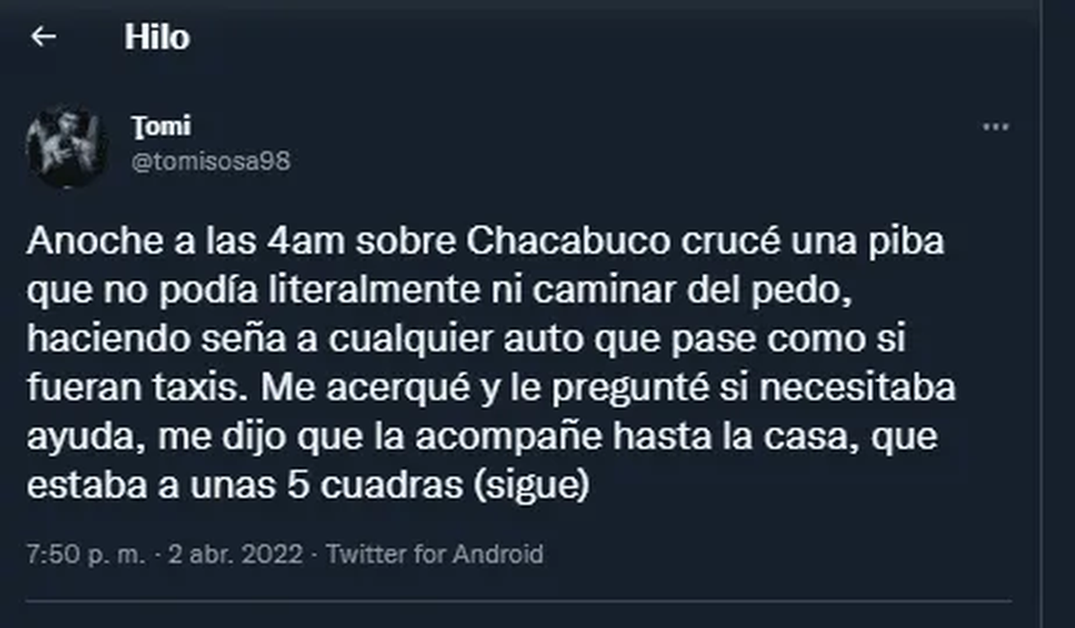 "Anoche a las 4 AM sobre Chacabuco me crucé a una piba, que no podía literalmente ni caminar del pedo, haciendo seña a cualquier auto que pase como si fueran taxis. Me acerqué y le pregunté si necesitaba ayuda. Me dijo que la acompañe hasta la casa que estaba a unas 5 cuadras", comenzó tuiteando Tomi.