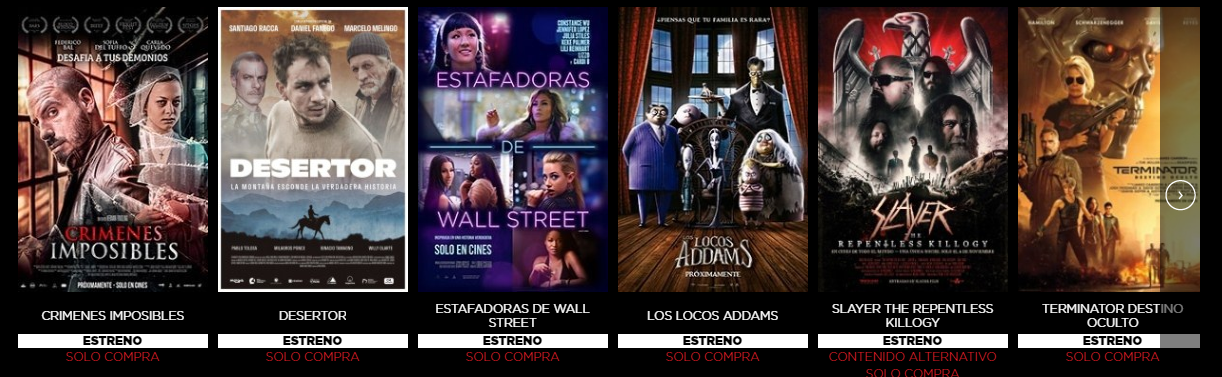 Los estrenos de cine son: “Crímenes imposibles”, “Desertor”, “Estafadoras de Wall Street”, “Los locos Addams” y “Terminator: destino oculto”