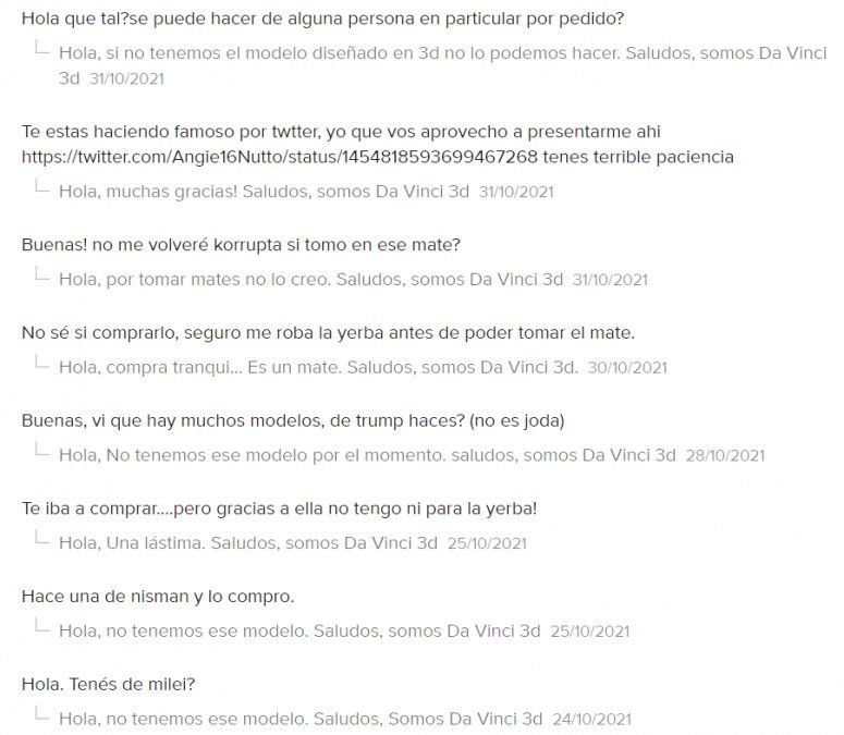 Sin embargo, uno de los que más llamaron la atención fue precisamente el del ex presidente, cuyo modelo llegó a Twitter por los divertidos comentarios de los compradores en la publicación, que fueron los siguientes: “¿No se fuga la yerba?”; “Hola, no me deja pagar en dólares, ¿cómo hago para poder pagar?; “Lo agregué al carrito pero ahora me dice 'teléfono intervenido'... ¿Qué podrá ser?”; “Yo laburo en un juzgado, ¿lo puedo llevar a tribunales o no?”; “Hola, quería consultar si hacen envíos a Panamá y a Suiza”; “Buenas, ¿lo puedo pagar con un bono a 100 años? Gracias” y "¿No tenes de Patricia Bullrich para tomar vino?", fueron algunos de los comentarios más desopilantes.