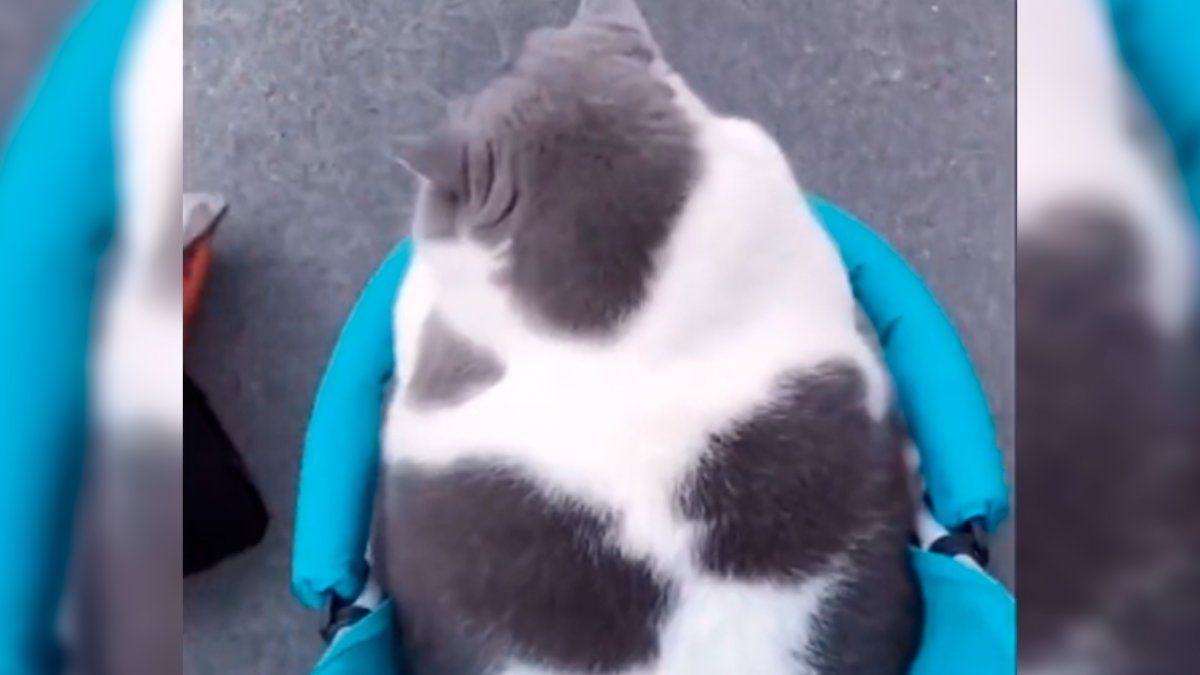En el impresionante video podemos ver que el gatito es tan grande que batalla para conseguir subirse y dar un paseo, y cuando por fin lo consigue se ve tan apretado que parece que se va a salir, lo que lo hace aún más tierno.