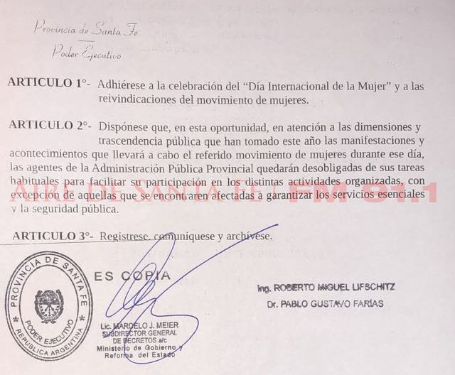 La decisión, que se dio a conocer en la noche de este lunes y a la cual Aire de Santa Fe accedió a modo de primicia, otorga un permiso especial a aquellas mujeres que deseen asistir a las distintas manifestaciones por el Día Internacional de la Mujer Trabajadora, para que puedan realizarlo sin que ello afecte su labor.