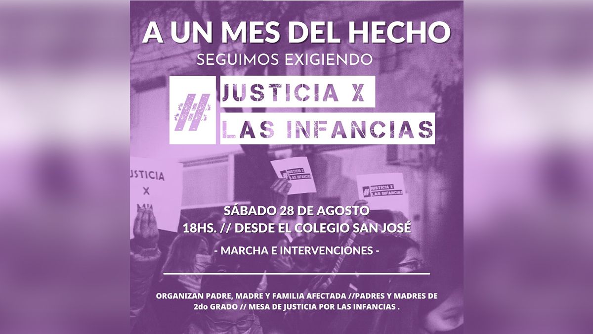 “La escuela dejó desamparada mi hija, abandonaron a su alumna luego de conocerse el hecho”, se lamentó Vanesa, mamá de la niña. Por lo expuesto, y porque preservar y garantizar los derechos de las infancias debe ser prioridad para cualquier comunidad, se convoca a la población a marchar este sábado 28 de agosto. La concentración será frente al Colegio San José, a las 18. Desde allí partirá la marcha que recorrerá la Fiscalía, el Obispado y la Jefatura, regresando luego al punto de inicio", sostiene.