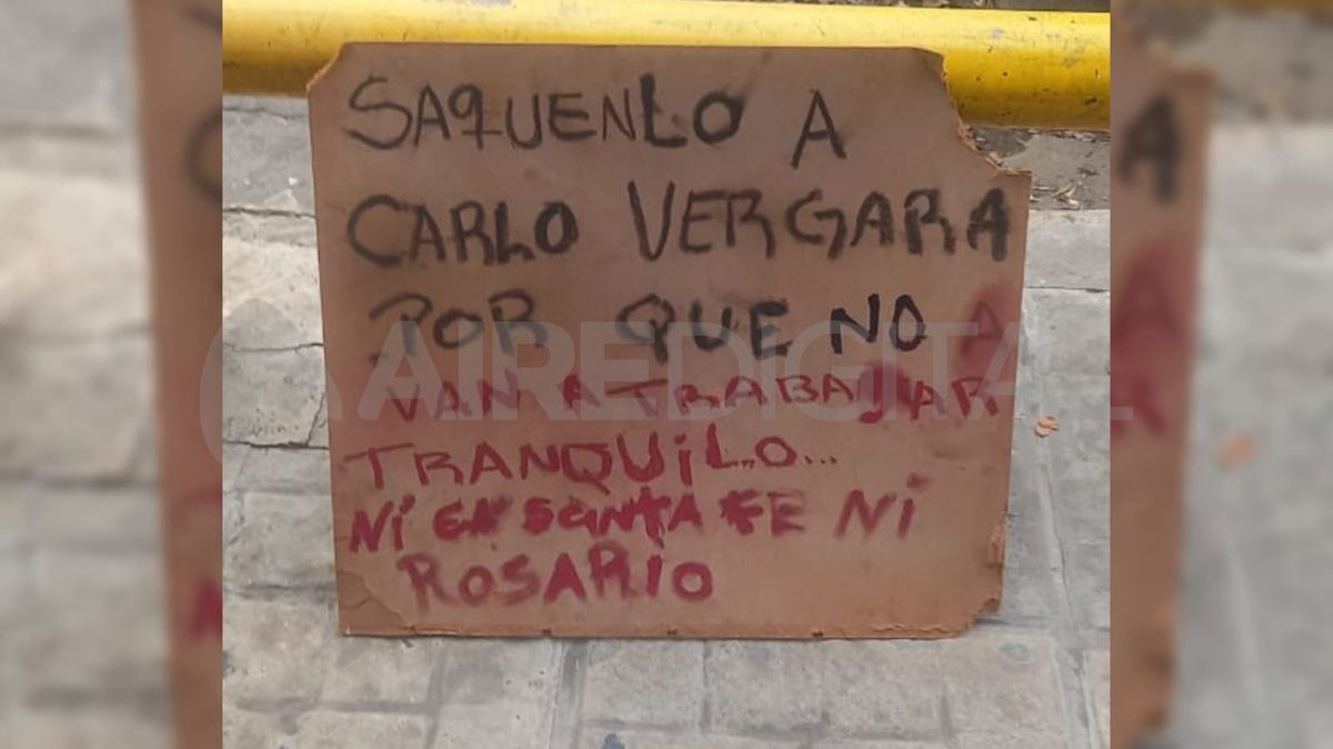 En el cartel que fue arrojado por los agresores previo a efectuar los disparos se puede leer un mensaje contra el secretario general del gremio en Rosario, Carlos Vergara, quien en 2017 fue interventor de la seccional La Plata tras la detención de su titular, Juan Pablo "Pata" Medina.