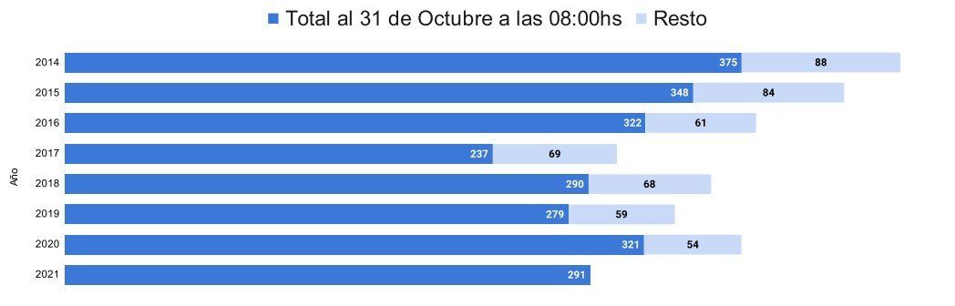 El año con más homicidios, desde enero a octubre, fue 2014, en el que se informaron 375 crímenes. En 2015, el número disminuyó a 348 y en 2016 a 322. En 2017, se contabilizaron 237 asesinatos y en 2018 la cantidad aumentó a 290, un número similar a este año.