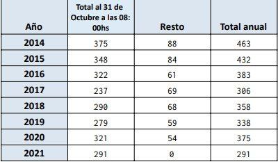 Según el informe, en toda la provincia se cometieron 291 homicidios desde el primer día de este año hasta este domingo 31 de octubre. En 2020, el total hasta la misma fecha fue de 321 asesinatos. Además, la cantidad de homicidios en 2021 aumentó en un 5% en comparación con el año 2019, cuando se contabilizaron 279.