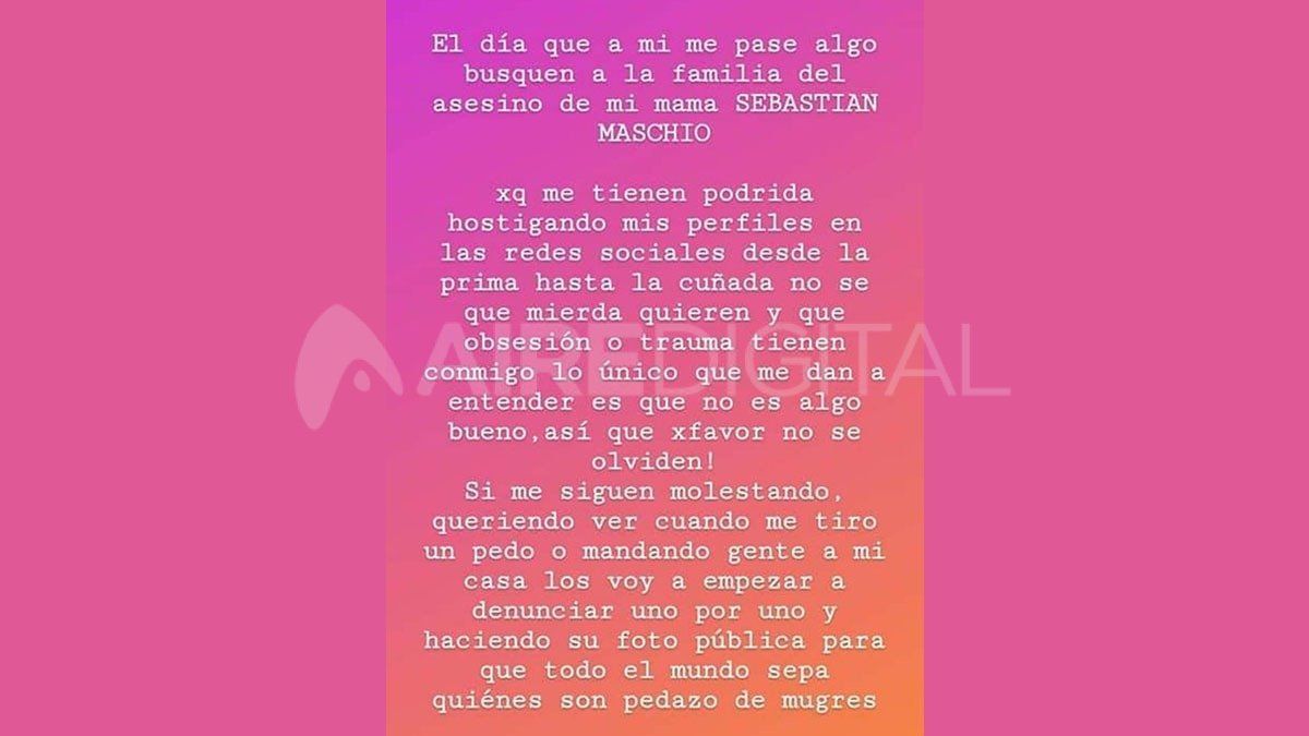 “Maschio era el mejor amigo del gran amor de la vida de mi mamá. Su ex la hizo sufrir mucho, mi mamá la pasó mal y ahí él aprovechó esa situación para acercarse. Le decía que si era su mujer iba a tener esto, lo otro. Y ella le decía que no, pero tomándolo a chiste, él insistía pero ya se había vuelto una obsesión. Eso es lo único que sabía hasta qué pasó lo que pasó y me di cuenta lo que había atrás”, se lamentó la joven.