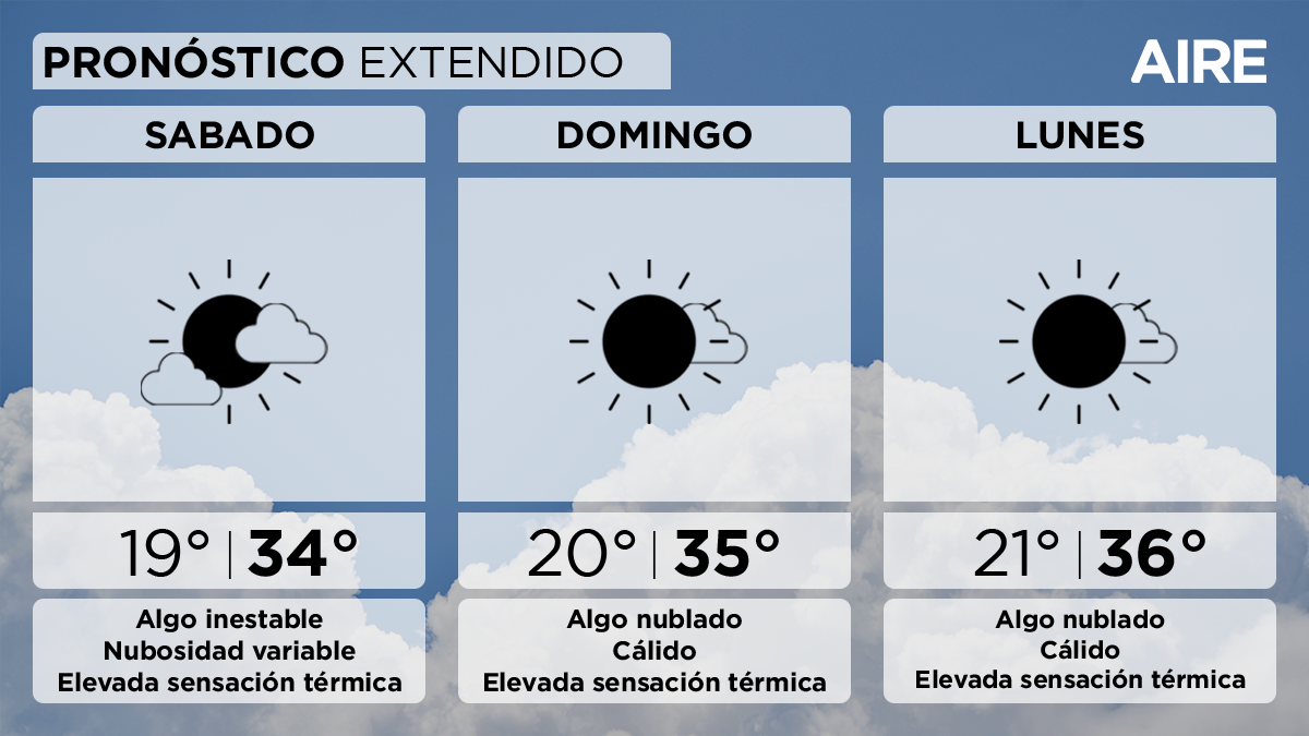 El domingo también habrá alguna nubosidad y condiciones levemente inestables por la mañana. Temperatura mínima de 20°, máxima de 35° y viento leve a moderado del sur.