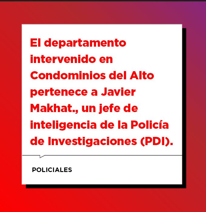 La sorpresa mayúscula llegó al allanar otra propiedad. Se trata de un segundo piso en los Condominios del Alto, un complejo de alta gama construido por desarrolladores inmobiliarios al lado del shopping Alto Rosario. En ese departamento valuado en USD 250 mil encontraron viviendo al segundo jefe de Inteligencia de Drogas de la Policía de Investigaciones de Rosario (PDI), comisario Javier Makhat. En las dos cocheras correspondientes a la propiedad había un vehículo asignado a PDI sin plotear y una camioneta Jeep flamante que pertenece al oficial. “Hay que investigar si existe una vinculación entre estas dos personas o es producto de una casualidad”, afirmó el fiscal Matías Ederi. Agregó que el comisario sostuvo que compró el inmueble en 2014.
