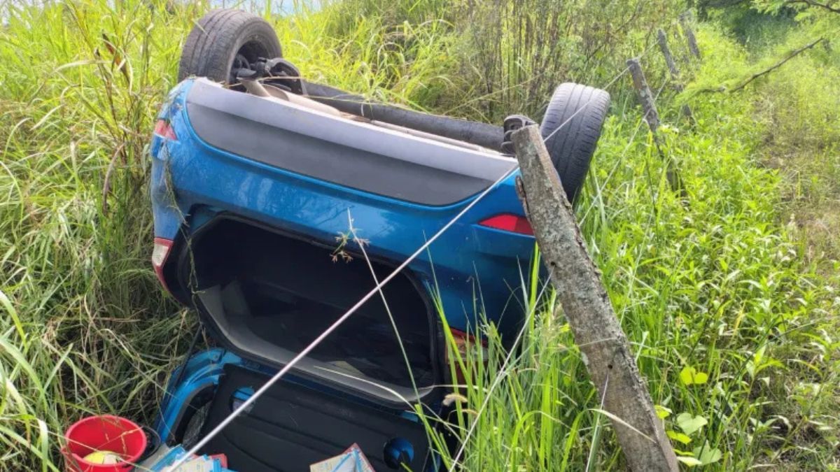 Impactante vuelco en un camino rural del norte de Santa Fe: el auto terminó con las ruedas hacia arriba