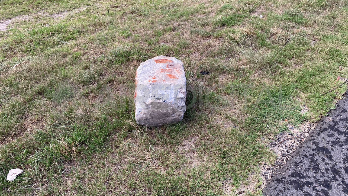 Como consecuencia del impacto que sufrió el auto tras chocar contra el adoquín, el tren delantero quedó destrozado al igual que la rueda delantera izquierda. El trozo de concreto tiene una dimensión de 60 por 30 centímetros.