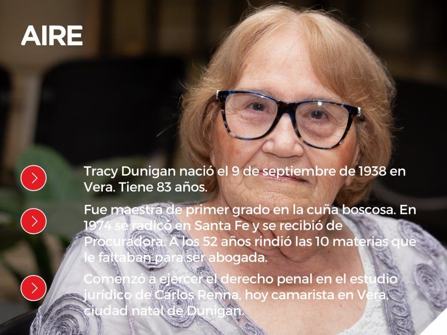 Tracy Dunigan nació en Vera hace 83 años y se enamoró del derecho en el colegio secundario, inspirada por las clases del juez Agustín Rossi. Egresó con título de maestra de escuela y dio clases en la cuña boscosa: “ahí vi las injusticias que sufría la gente, y pensaba cómo podía hacer para ayudarlos”.