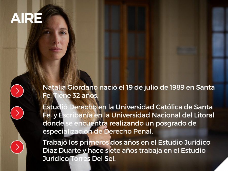 Natalia Giordano nació en Santa Fe en 1989 y se inclinó por el derecho penal en la facultad: “me apasionó desde la primera clase”, sin embargo, admitió que “es un ambiente hostil, no por una cuestión de género sino porque lo penal de por sí son cuestiones difíciles. Y si te ven mujer, y joven, te miran con desconfianza. Después de la audiencia te felicitan”, sostuvo Giordano. Es difícil acceder, hacerse un lugar. Yo no vengo de familia de abogados, me llevó mucho trabajo".