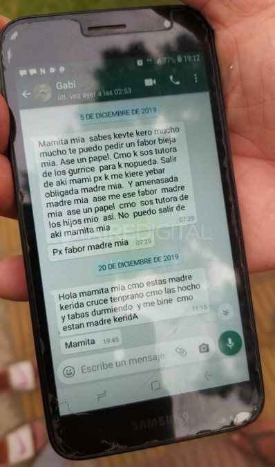 Gladys tenía miedo de que esto pasara: "ella me mandó un mensaje pidiéndome ayuda", contó la mujer y mostró el chat que mantuvo el 5 de diciembre con Gabriela. En el mensaje, la mujer muerta pedía que su madre postiza se hiciera cargo de sus cuatro hijos de 7, 9, 11 y 14 años.