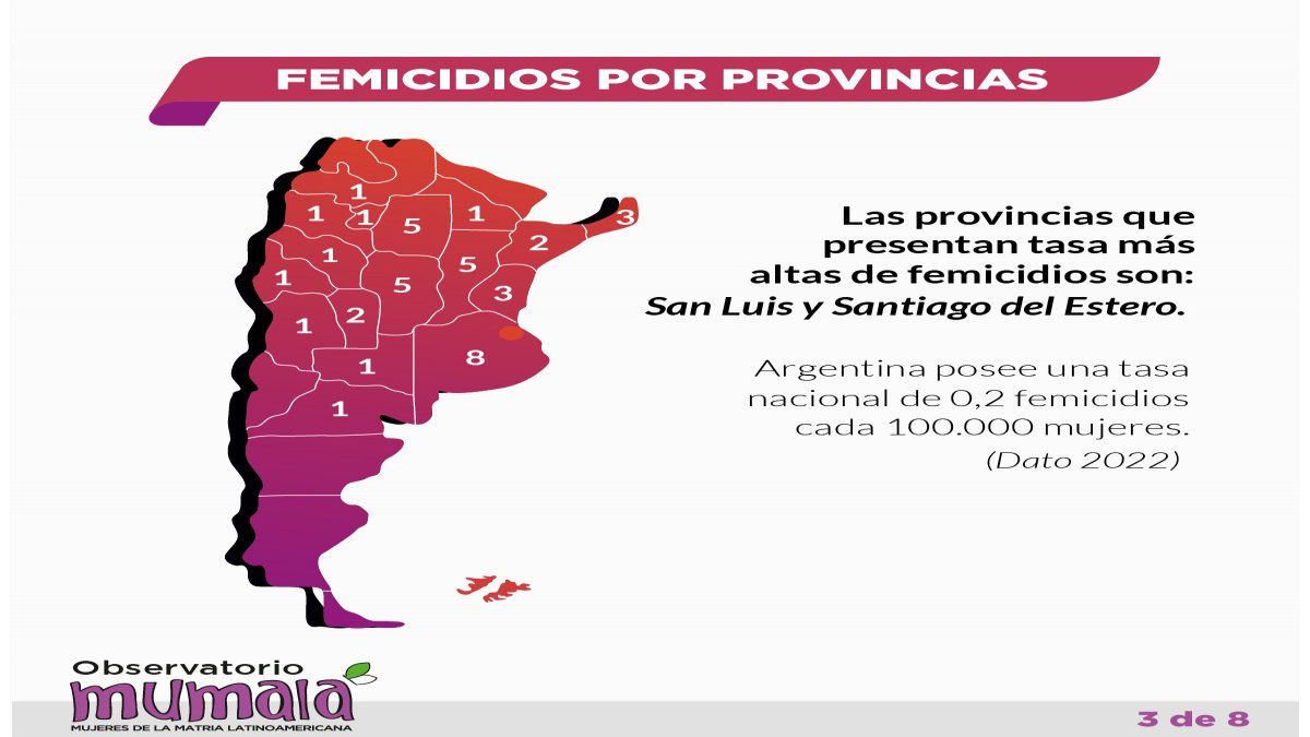 Además, se registraron 62 intentos de femicidios y 52 niños, niñas y adolescentes se quedaron sin madre. El Observatorio denunció que se produce una muerte violenta cada 21 horas y reclamó la declaración de Emergencia NiUnaMenos, según el comunicado. Las cifras revelan que las provincias con tasas más altas de femicidios son San Luis (0.8%) Santiago del Estero (0.6%) .