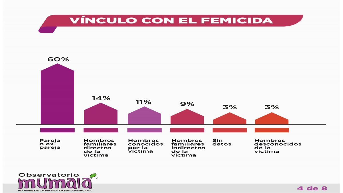 A su vez, el 60% de los femicidios fue cometidos por parejas o exparejas; un 14% por familiares directos; un 11% por hombres conocidos; un 9% por familiares indirectos; un 3% por desconocidos y en otro 3% se carece de ese dato.