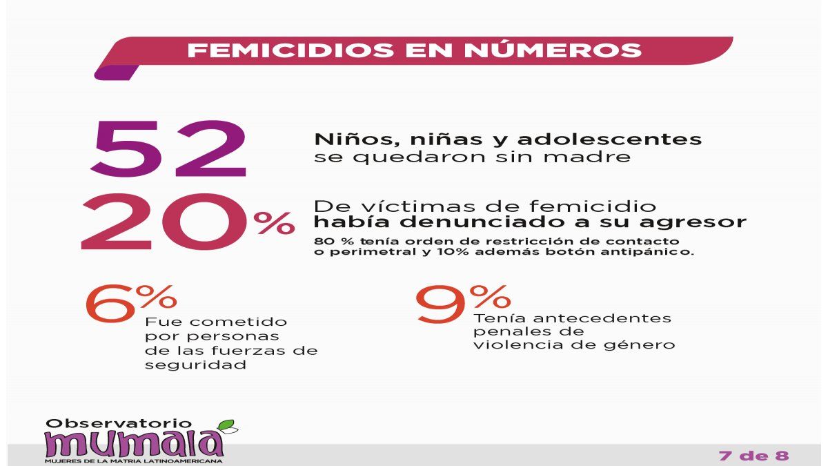 Además, el 20% de las víctimas había denunciado a su agresor y de ese porcentaje el 80% tenía orden de restricción de contacto o perimetral y el 10% un botón antipánico.
