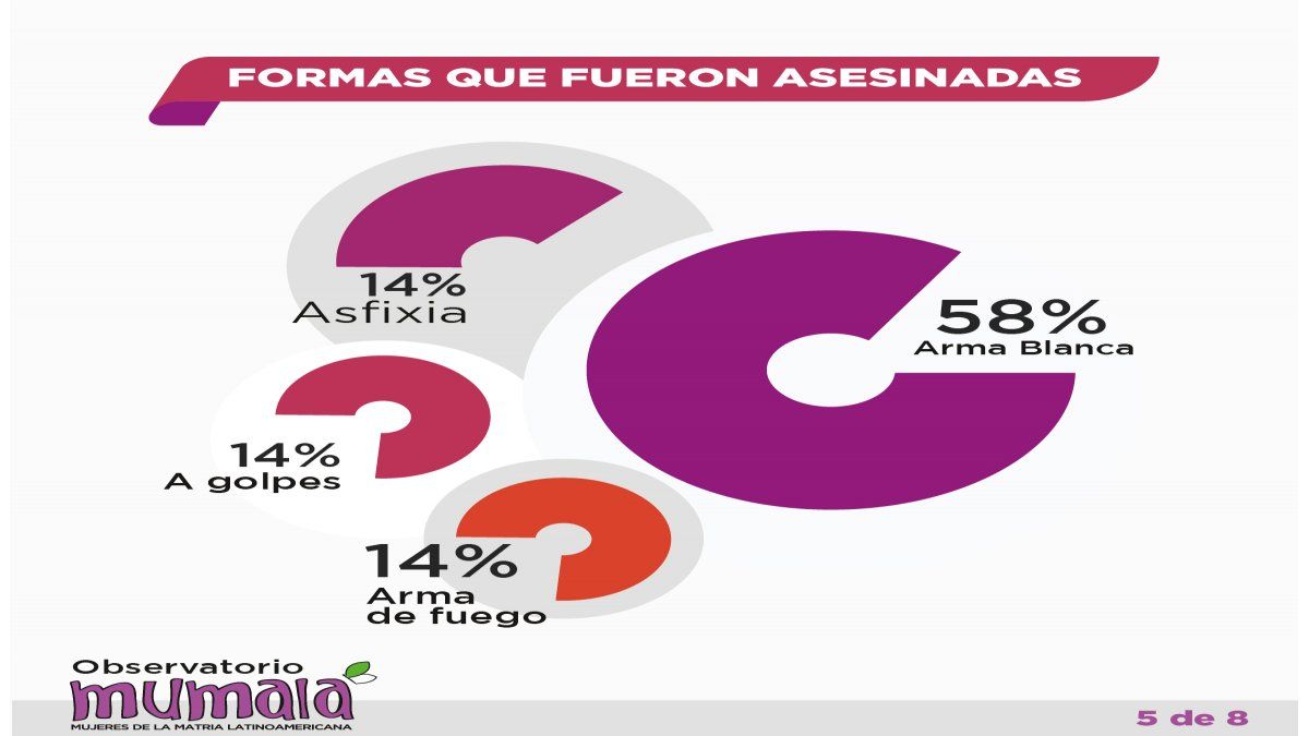 Siempre de acuerdo a este relevamiento, en el 58% de los casos las víctimas fueron asesinadas con arma blanca y en segundo lugar, con sendos 14%, por arma de fuego, por golpes y por asfixia.