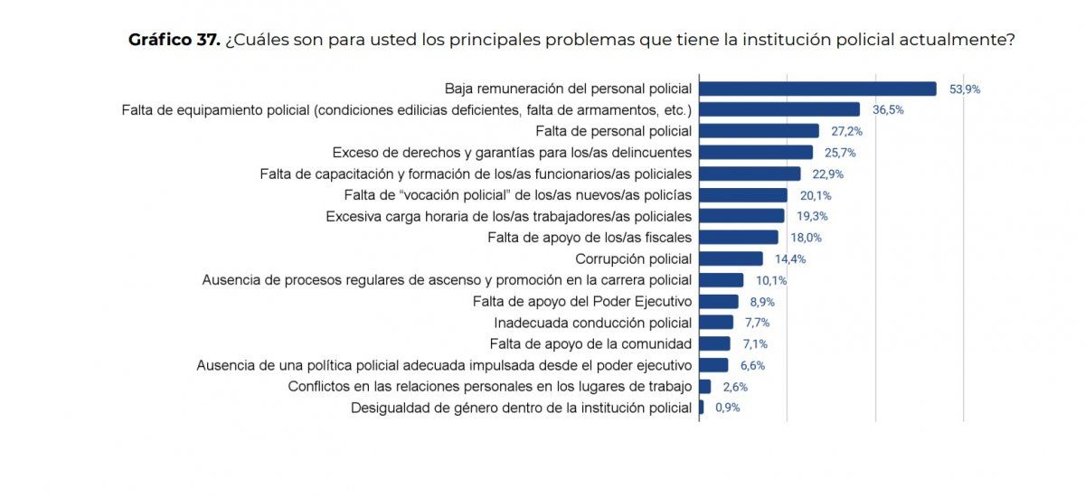 En línea con ello, el informe señaló también que sobre los principales problemas que tiene la institución policial actualmente, la situación salarial es el primero. Es que el 57% sostuvo que la baja remuneración es la génesis de gran parte de los problemas que tiene la institución encargada de prevenir el delito.